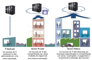 Privada – Já o modelo de nuvem privada, além de conter os recursos de uma nuvem pública, tem o diferencial de um servidor dedicado e exclusivo para as regras de negócio da empresa contratante, suas filiais e/ou grupo. E somente usuários e operadores credenciados acessam os recursos do servidor. Esses acessos são sempre criptografados e/ou feitos através de uma VPN (virtual private network – rede virtual privada), e por ser personalizado para as demandas da empresa contratante normalmente os provedores não disponibilizam recursos IaaS de customizações nos servidores e ativos de rede. A infraestrutura fica limitada a personalização solicitada. Mas ainda assim a disponibilidade, backups e redundância ficam a cargo do provedor para atender a demanda pré acordada entre a empresa contratante e o provedor contratado.