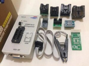 Eis a nossa gravadora com vários adaptadores para gravação de BIOS e FIRMWARES de diversos equipamentos, inclusive de um equipamento para outro idênticos sem precisar remover a placa mãe.