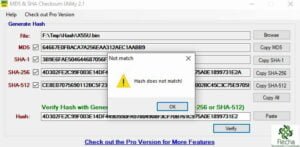 5) Mas se o resultado apresentado for como o que está demonstrado abaixo (hash does not match – hash não corresponde!), significa que o arquivo está corrompido e deve ser descartado. ( Esse efeito fizemos deletando o último caracter da linha hash do arquivo). Teste você também.